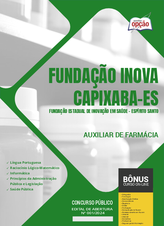 A Apostila Fundação INOVA Capixaba - Fundação Estadual de Inovação em Saúde - Espírito Santo - ES 2024 - AUXILIAR DE FARMÁCIA foi elaborada de acordo com o edital 001/2024, por professores especializados em cada matéria e com larga experiência em concursos.