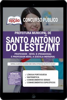A Apostila Prefeitura de Santo Antônio do Leste - MT - Professor - Nível B (Pedagogia) e Professor Nível A (Escola Indígena) foi elaborada de acordo com o edital 1, por professores especializados em cada matéria e com larga experiência em concursos.