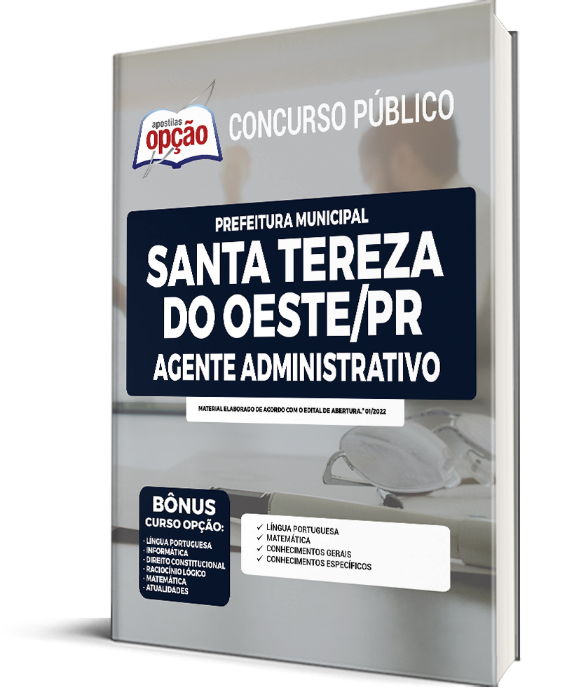 A Apostila Prefeitura de Santa Tereza do Oeste - PR - Agente Administrativo foi elaborada de acordo com o edital 01/2022, por professores especializados em cada matéria e com larga experiência em concursos.