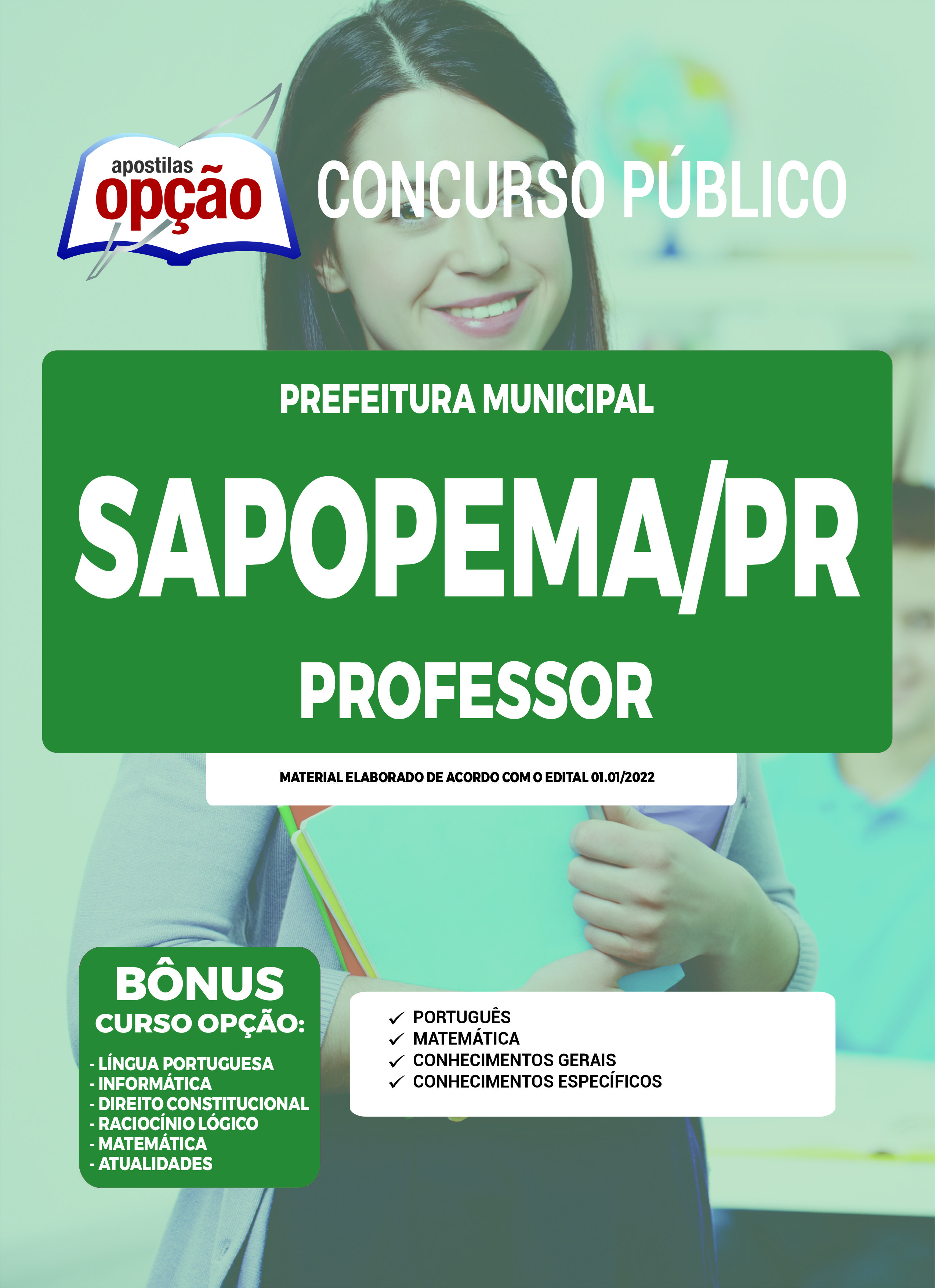 A Apostila Prefeitura de Sapopema - PR - Professor foi elaborada de acordo com o edital 01.01/2022, por professores especializados em cada matéria e com larga experiência em concursos.