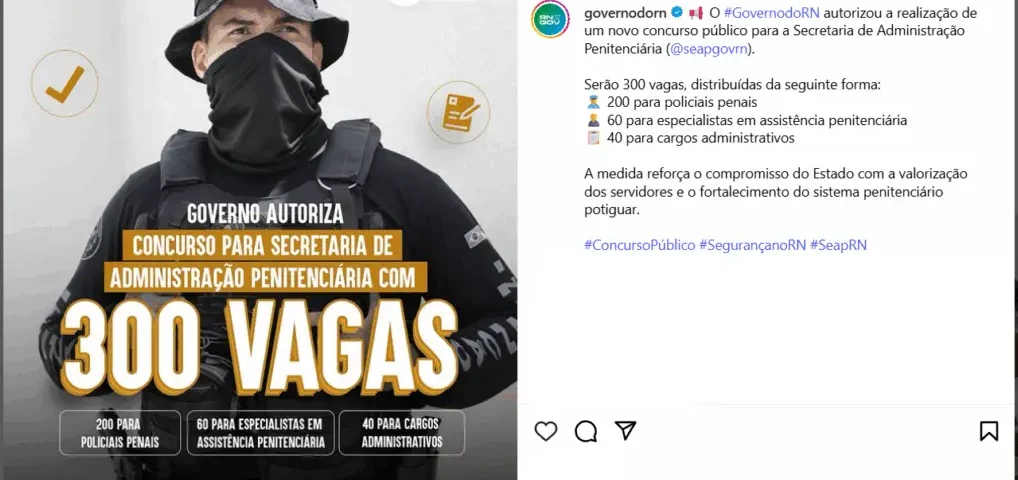 Conforme o anúncio oficial, o concurso Polícia Penal RN ofertará 300 vagas, distribuídas entre os cargos previstos no edital. Confira abaixo a publicação oficial:
